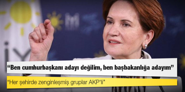 İYİ Parti lideri Meral Akşener, kendisinin Cumhurbaşkanı değil Başbakan adayı olduğunu belirterek, “Bunu bir kaç defa daha söyledim ama anlaşılmadı. Burada net bir şekilde açıklayayım. Cumhurbaşkanlığına aday değilim. Başbakanlığa adayım” dedi.