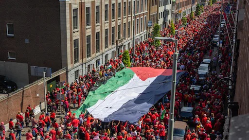 Hollanda’nın başkenti Amsterdam’da hükümetin İsrail’e yönelik tutumunu protesto etmek için düzenlenen “Kırmızı Hat” yürüyüşüne yaklaşık 250 bin kişi katıldı. Bu, ülke tarihinin en büyük protestolarından biri olarak değerlendiriliyor.