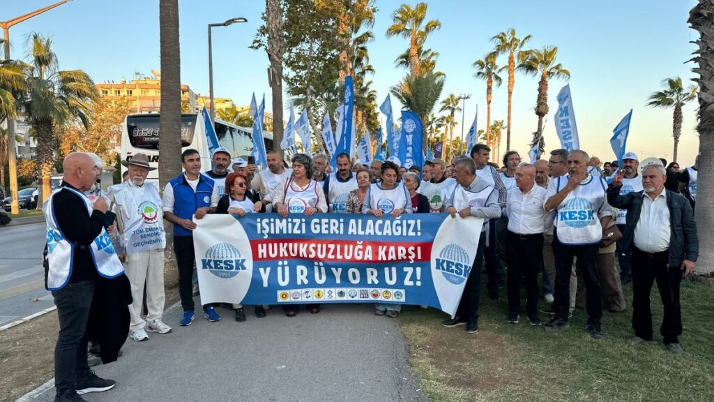 Farlı tarihlerde Kanun Hükmünde Kararname (KHK) ile ihraç edilen kamu emekçilerinin görevlerine iade edilmesi talebiyle yürüyen kamu emekçileri, Mersin’de bir araya geldi. Mersin Kamu Emekçileri Sendikası (KESK) Şubeler Platformu’nun çağrısıyla Sahil Mado önünde bir araya gelen emekçiler, “KHK’lar gidecek, biz kalacağız”, “İşimizi geri istiyoruz” ve “Adalet istiyoruz” sloganlarıyla Özgecan Aslan Meydanı’na kadar yürüdü. Halkların Eşitlik ve Demokrasi Partisi (DEM Parti) milletvekilleri, sivil toplum örgütleri ve çok sayıda yurttaşın destek verdiği yürüyüşte sık sık, “Yaşasın onurlu mücadelemiz” sloganları atıldı. Yürüyüş boyunca yapılan konuşmalarda, KHK’lerin yalnızca birer idari işlem değil, aynı zamanda emekçilerin onuruna yönelmiş bir saldırı olduğu belirtilerek, adaletin tesis edilmesi için mücadele çağrısı yapıldı.