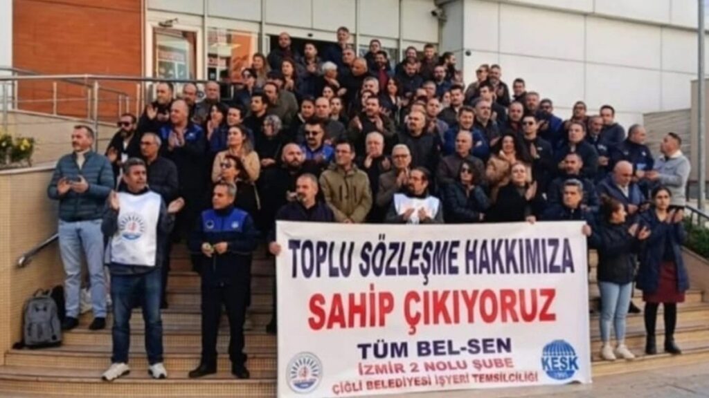 Çiğli Belediyesi işçileri, Tüm Belediye ve Yerel Yönetim Hizmetleri Emekçileri Sendikası (Tüm-Bel-Sen) öncülüğünde Çiğli Belediyesi önünde Toplu İş Sözleşmesi’nde  (TİS) imzalanan ve alamadıkları Sosyal Denge Tazminatı (SDT) ödemeleri için eylem gerçekleştirdi. Basın açıklamasını Tüm-Bel-Sen İzmir 2 No’lu Şube Başkanı Nihat Filiz yaptı.