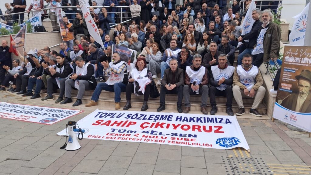 Toplu iş sözleşmesinden kaynaklanan hakları ödenmeyen Çiğli Belediyesi’nde, memurlar iş bırakarak eylem yaptı. Belediye binası önünde bir araya gelen belediye çalışanları, “Toplu sözleşme hakkımıza sahip çıkıyoruz” pankartı açtı. Kentte bulunan siyasi parti ve kurumların temsilcilerinin de katılarak destek verdiği eylemde açıklama yapan Tüm Belediye ve Yerel Yönetim Hizmetleri Emekçileri Sendikası (TÜM BEL-SEN) İzmir 2 No’lu Şube Başkanı Nihat Filiz, sabırlarının tükendiğini, alın terlerine sahip çıkmak için iş bıraktıklarını söyledi.
