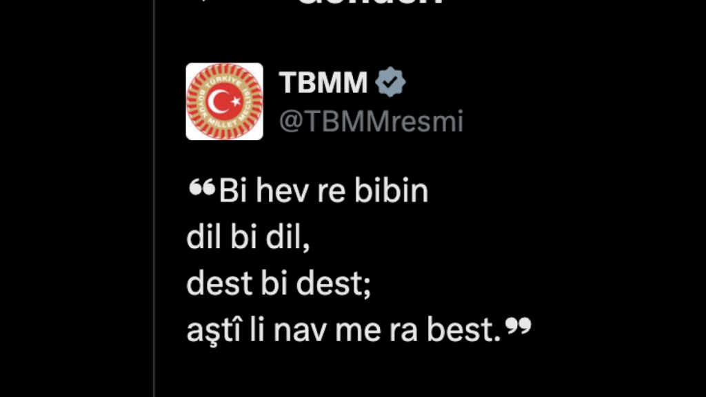 Meclis’in resmi X hesabı ilk kez Kürtçe bir paylaşım yaptı. Meclis Başkanı Numan Kurtulmuş’un Dicle Üniversitesi 2025-2026 Akademik Yılı açılış töreninde dile getirdiği “Bi hev re bibin dil bi dil, dest bi dest; aşîtî li nav me ra be” (Birbirinizle dil ile dil olun, el ile el; aramızda barış olsun) sözleri Meclis’in resmi hesabında Kürtçe olarak paylaşıldı. Ancak aynı Meclis, hâlâ Kürtçe konuşmaları “bilinmeyen dil” olarak tutanaklara geçiriyor.
