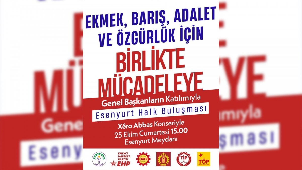 Halkların Eşitlik ve Demokrasi Partisi (DEM Parti), Emekçi Hareket Partisi (EHP), Emek Partisi (EMEP), Sosyalist Meclisler Federasyonu (SMF), Türkiye İşçi Partisi (TİP) ve Toplumsal Özgürlük Partisi (TÖP), “Ekmek, barış, adalet ve özgürlük için birlikte mücadeleye” şiarıyla 25 Ekim’de Esenyurt Meydanı’nda miting düzenleyecek. Düzenleyici partilerin eş genel ve genel başkanlarının konuşma yapacağı mitingde Türkiye’de yurttaşların yaşadığı temel sorunlara dikkat çekilecek. Mitinge dair katılım çağrıları ise il genelinde devam ediyor.