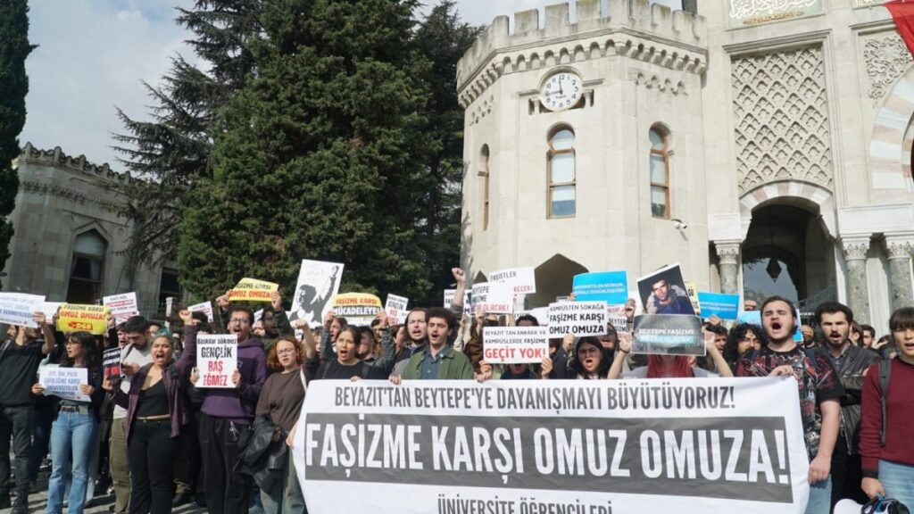 İSTANBUL – Üniversite öğrencileri, Hacettepe Üniversitesi’nde Ülkü Ocakları’nın “devir-teslim” etkinliğini protesto eden öğrencilere maskeli kişiler tarafından düzenlenen palalı saldırıyı protesto etti.