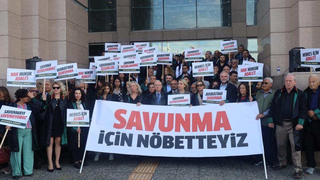 İstanbul Barosu’na üye avukatlar, İstanbul Adliyesi önünde avukatlara dönük baskılara karşı “Adalet Nöbeti” tuttu. “Adalet Nöbeti”ne, İstanbul Büyükşehir Belediye Başkanı (İBB) Ekrem İmamoğlu’nun eşi Dilek İmamoğlu, İstanbul Barosu Başkanı İbrahim Kaboğlu, yerine kayyım atanan Esenyurt Belediye Başkanı Ahmet Özer’in kızı Seraf Özer’in yanı sıra çok sayıda avukat katıldı. Nöbette, “Savunma için nöbetteyiz” pankartı açılırken, “Hak hukuk adalet”, “Savunmayı savunuyoruz”, “Herkes için adalet”, “Savunma tutuklanamaz” ve “Avukatıma dokunma” dövizleri taşındı. Nöbette sık sık “Savunma susmadı susmayacak” sloganı atıldı.