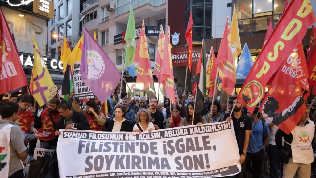 İZMİR – Siyasi parti ve sivil toplum örgütleri, İsrail tarafından ablukaya alınan Sumud Filosu’na dair basın açıklaması gerçekleştirerek, iktidarın İsrail’le ticareti kesmesi gerektiğini vurguladı.