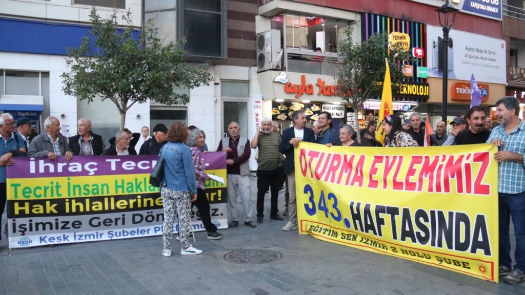 Kamu Emekçileri Sendikaları Konfederasyonu (KESK) İzmir Şubesinin, Kanun Hükmünde Kararnamelerle (KHK) işten çıkarılmaları protesto etmek amacıyla her çarşamba düzenlediği oturma eylemini 343’üncü haftasında da Karşıyaka çarşı girişinde devam ettirdi. “İhraç tecrittir. Tecrit insan hakları ihlalidir. Hak ihlallerine hayır. İşimize geri döneceğiz” pankartı açılan açıklamada sık sık “Hak hukuk adalet”, “KESK’li ihraçlar onurumuzdur”, “Savaşa hayır barış hemen şimdi” sloganları atıldı. Açıklamaya kentte bulunan siyasi parti ve kurum temsilcileri de katıldı.