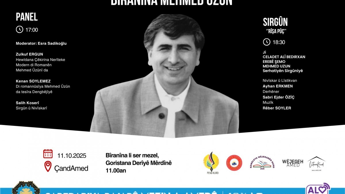 Amed Büyükşehir Belediyesi, Kürt edebiyatının önemli isimlerinden yazar Mehmed Uzun’u, ölüm yıl dönümünde anma etkinlikleri düzenleyecek. 11 Ekim’de gerçekleştirilecek anma etkinlikleri, saat 11.00’de, Mehmed Uzun’un Mardinkapı Mezarlığı’ndaki kabri başında yapılacak törenle başlayacak.