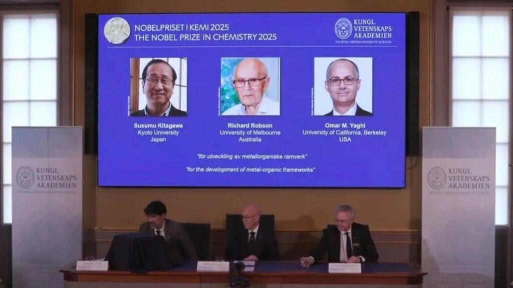 İsveç Kraliyet Bilimler Akademisi, 2025 Nobel Kimya Ödülü’nün sahiplerini açıkladı. Bilim insanları Susumu Kitagawa, Richard Robson ve Omar M. Yaghi, “Metal-organik çerçevelerin geliştirilmesi” alanındaki çalışmalarıyla 2025 Nobel Kimya Ödülü’nü kazandı. Kazananlar düzenlenen basın toplantısı ile açıklandı ve fotoğrafları duvara yansıtıldı.