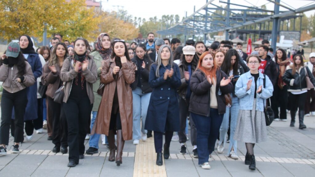 Açıklamanın ardından kitle, “Jin jiyan azadî”, “Berxwedan ji bo Rojîn berxwedan”, “Erkek vuruyor devlet koruyor”, “Rektör istifa” sloganları ve alkışlarla Eğitim Fakültesi önüne kadar yürüdü. Eğitim Fakültesi Dekanlık Binası önüne gelen gençler, ”O gece hepiniz neredeydiniz?”, “Adalet adalet Rojin için adalet” sloganları atarak yürüyüşü sonlandırdı.