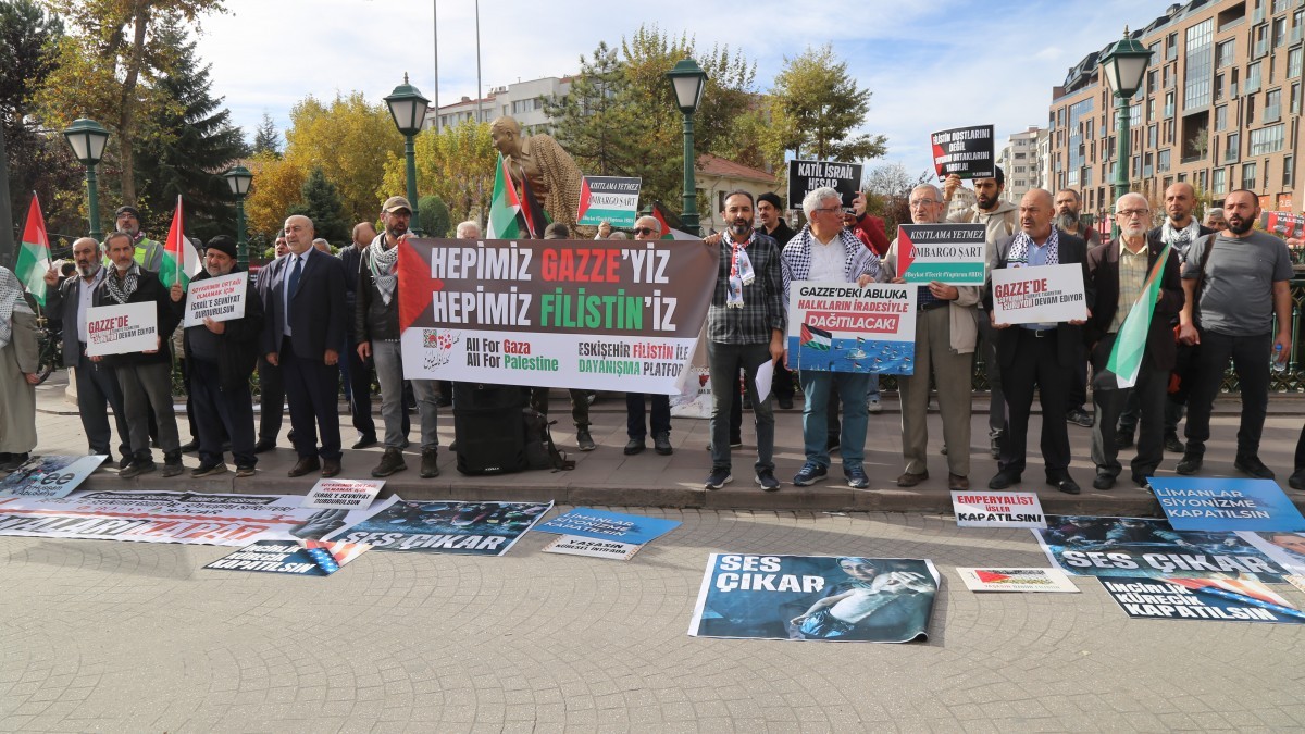 Eskişehir Filistin ile Dayanışma Platformu, 10 Ekim 2025’te Gazze’de yapılan ateşkes anlaşmasına ilişkin Köprübaşı’nda açıklama yaptı. “Hepimiz Gazze’yiz hepimiz Filistin’iz” pankartının açıldığı, “Katil İsrail işbirlikçi AKP” ve “Yaşasın küresel intifada” sloganlarının atıldığı açıklamayı, platform üyesi Uygar Kurtcu yaptı.