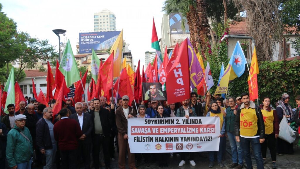 İzmir’de Siyasi parti ve sivil toplum örgütleri, İsrail’in Filistin’e yönelik saldırılarını protesto etmek için Alsancak’ta bulunan ÖSYM Binası önünde bir araya gelerek, Türkan Saylan Kültür Merkezi’ne doğru yürüyüş gerçekleştirdi. Yürüyüşte “Soykırımın 2’nci yılında savaşa ve emperyalizme karşı Filistin halkının yanındayız” pankartı açılırken, “Bölgede barış ülkede demokrasi”, “İsrail’i destekleyen politikalara son” dövizleri açıldı. Sık sık “Katil İsrail işbirlikçi AKP”, “Savaşa hayır barış hemen şimdi” sloganları atıldı.