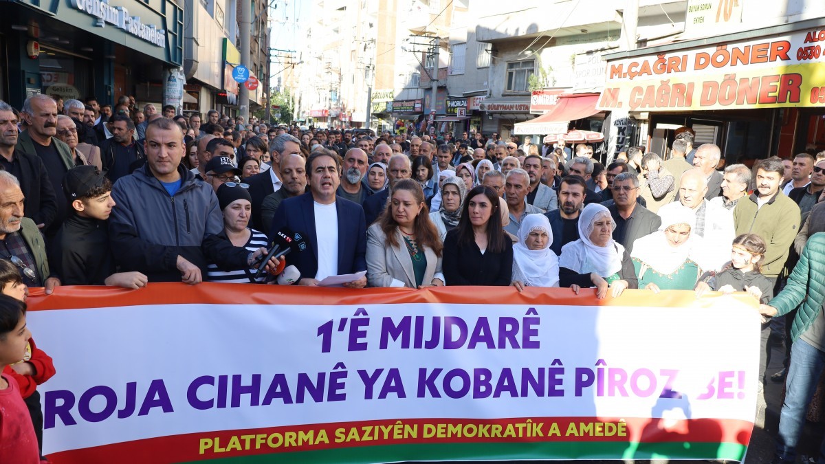Amed’de 1 Kasım Dünya Kobanê Günü dolayısıyla Rêzan (Bağlar) ilçesi Dörtyol Kavşağı’nda bir araya gelen Demokratik Kurumla Platform üyeleri açıklama yaptı. “1’ê Mijdarê roja cîhanê ya Kobanê pîroz be” pankartının açıldığı açıklamada, “Bijî berxwedana Kobanê, “Jin jiyan azadî”, “Bijî Serok Apo”, ve “Bê serok jiyan nabe” sloganları atıldı. Metnin Kürtçe’sini DBP Amed İl Eşbaşkanı Ruçem Elyakut, Türkçesini ise DEM Parti Amed İl Eşbaşkanı Abbas Şahin okudu.