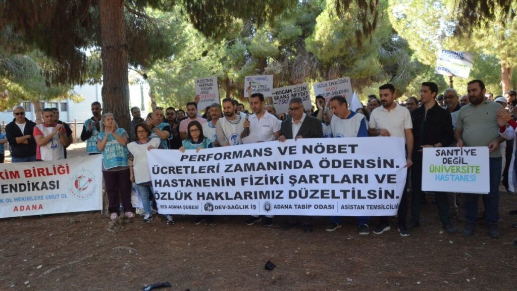Çukurova Üniversitesi Tıp Fakültesi Balcalı Hastanesi asistan hekimleri, performans ve nöbet ücretlerinin ödenmemesi nedeniyle bir günlük iş bırakma eylemine gitti. Başhekimlik binası önünde yapılan açıklamada asistanlar adına basın metnini okuyan Dr. Umut Pektaş, nöbet ücretlerinin aylardır son iki aydır ise teşvik ödemelerinin yapılmadığını ve bunun sağlık çalışanlarını ciddi ekonomik çıkmaza soktuğunu ifade etti.