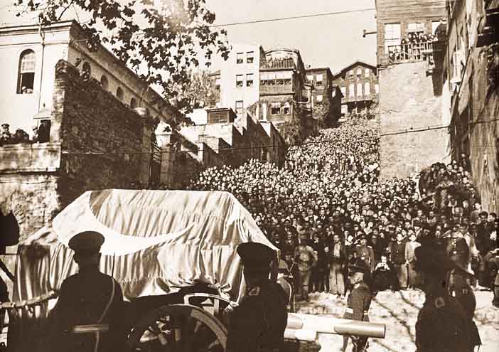 Atatürk’ün naaşı, 19 Kasım 1938’te saat Dolmabahçe’den çıkarılarak top arabasına konuldu. Kortej, Tophane, Karaköy, Köprü yolu, Eminönü Meydanı, Bahçekapı, Sirkeci, Salkımsöğüt, Gülhane Parkı’ndan geçerek, Sarayburnu’na geldi. Yüzbinlerce kişi caddelerde ağlayarak Atatürk’ü uğurladı.