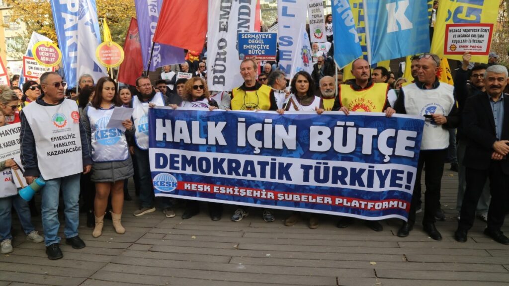 Eskişehir’de Köprübaşı’nda toplanan kamu emekçileri “Halk için bütçe demokratik Türkiye” pankartı açıp yürüyüş düzenledi. Emekçiler, “Halka bütçe savaşa değil” ve “Direne direne kazanacağız” sloganları atarak Yediler Parkına yürüdü. Kentteki diğer sendikalar ve siyasi partilerinde destek verdiği yürüyüş sonrası, KESK Şubeler Platformu Dönem Sözcüsü Umut Özge Yılmaz açıklama yaptı.
