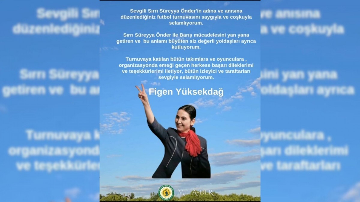 Figen Yüksekdağ’ın mesajı şöyle: “Sevgili Sırrı Süreyya Önder’in adına ve anısına düzenlediğiniz futbol turnuvasını saygıyla ve coşkuyla selamlıyorum. Sırrı Süreyya Önder ile barış mücadelesini yan yana getiren ve bu anlamı büyüten siz değerli yoldaşları ayrıca kutluyorum. Turnuvaya katılan bütün takımlara ve oyunculara, organizasyonda emeği geçen herkese başarı dileklerimi ve teşekkürlerimi iletiyor, bütün izleyici ve taraftarları sevgiyle selamlıyorum.”