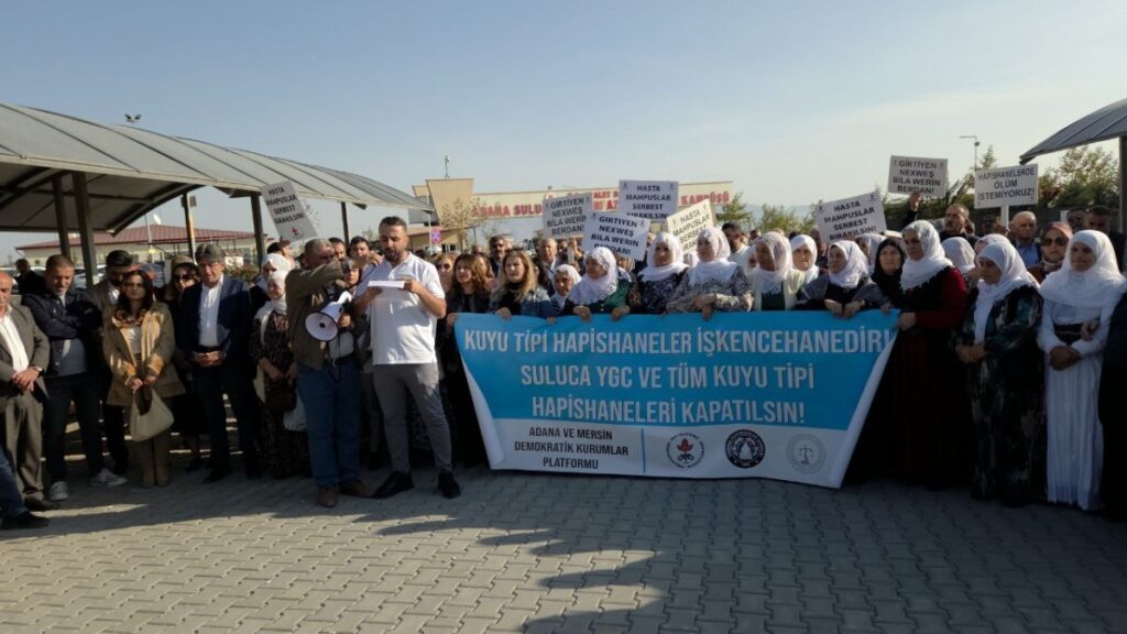 Adana ve Mersin Demokratik Kurumlar Platformu, cezaevlerinde devam eden hak ihlallerine karşı Suluca 1 No’lu Yüksek Güvenlikli Cezaevi önünde açıklama yaptı. Açıklamada, Özgürlük İçin Hukukçular Derneği Adana Temsilcisi Aziz Sari, son yıllarda ardı ardına inşa edilen S, Y ve yüksek güvenlikli cezaevlerinde tutsakların tamamen yalıtılmış, insanlık dışı koşullara mahkûm edildiğini belirtti. “Kuyu tipi” diye adlandırılan yeni cezaevlerinin tecridi derinleştirdiği vurgulayan Sari, “Bu yapılar cezalandırma amacıyla tasarlanmış tabutluklardır” dedi.