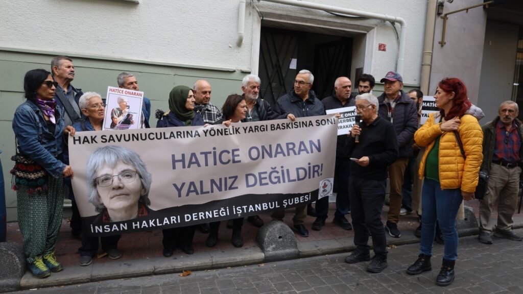 İnsan Hakları Derneği (İHD) İstanbul Şubesi Hapishaneler Komisyonu, tutsaklara para gönderdiği için “Terörü finansman etme” iddiasıyla 10 Ekim 2024’ten bu yana Gebze Kadın Kapalı Cezaevi’nde tutsak olan İHD Hapishaneler Komisyonu üyesi ağır hasta tutsak Hatice Onarana için Beyoğlu’nda bulunan dernek binası önünde basın açıklaması gerçekleştirdi. Eylemde “Hak savunucularına yönelik yargı baskısına son, Hatice Onaran yalnız değildir” pankartı açıldı.