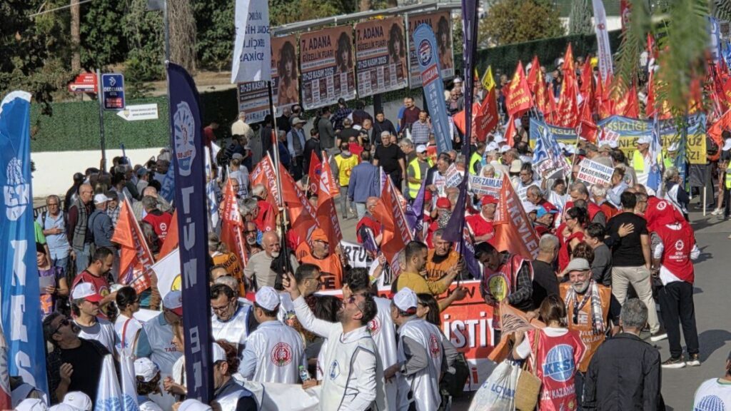 Kamu Emekçileri Sendikaları Konfederasyonu (KESK), Adana’da 14 kentin katılımıyla “Geçinemiyoruz! Halk için bütçe, Demokratik Türkiye” şiarıyla bölgesel bir miting düzenledi. Emek ve meslek örgütleri, siyasi partiler ve sivil toplum kuruluşlarının da destek verdiği miting, Kasım Gülek Köprüsü’nde toplanmanın ardından Uğur Mumcu Meydanı’na yapılan yürüyüşle başladı. Yürüyüş öncesi polis arama noktalarından geçen kitle, erbaneler eşliğinde halaylar çekerek yürüyüş koluna katıldı. Emekçiler sık sık “İnsanca yaşamak istiyoruz”, “Savaşa değil emekçiye bütçe” sloganlarıyla taleplerini dile getirdi. Emekçiler, yaşam koşullarının iyileştirilmesi, demokratik hakların genişletilmesi ve halktan yana bütçe politikalarının hayata geçirilmesi talebiyle mücadeleyi büyüteceklerini ifade etti.