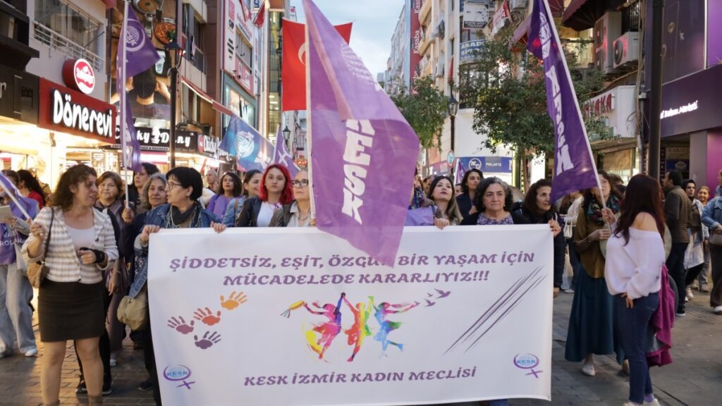 Kamu Emekçileri Sendikaları Konfederasyonu (KESK) İzmir Şubesinin Kanun Hükmünde Kararnamelerle (KHK) işten çıkarılmaları protesto etmek amacıyla her çarşamba düzenlediği oturma eylemini 347’nci haftasında da Karşıyaka çarşı girişinde devam ettirdi. Eylem öncesi KESK İzmir Kadın Meclisi Karşıykaka İzban önünde bir araya gelerek, Karşıyaka çarşı girişine kadar yürüyüş gerçekleştirdi. “Şiddetsiz eşit, özgür bir yaşam için mücadelede kararlıyız” pankartı açılan yürüyüşte kadınlar sık sık “Jin, jiyan, azadî”, “Kadınlar savaş istemiyor”, “Kadın cinayetleri politiktir” sloganları attı. Açıklamaya Halkların Eşitlik ve Demokrasi Partisi (DEM Parti) Karşıyaka İlçe Örgütünün yanı sıra çok sayıda sivil toplum örgütü temsilcisi ile kadın katıldı.