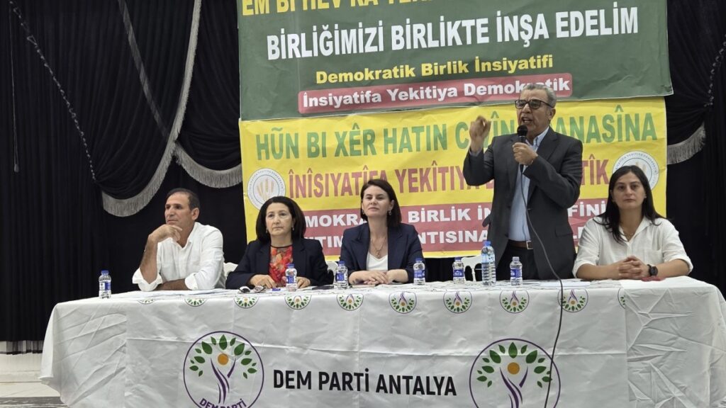 Demokratik Birlik İnisiyatifi, Antalya’nın Kepez ilçesindeki bir düğün salonunda tanıtım toplantısı gerçekleştirdi. Kürtçe ve Türkçe yazılı “Birliğimizi birlikte inşa edelim” pankartının asıldığı toplantıya, Demokratik Birlik İnisiyatifi Eşsözcüsü Gülcan Kaçmaz Sayyiğit ile kentte bulunan siyasi parti ve demokratik kitle örgütü temsilcilerinin yanı sıra çok sayıda kişi katıldı.