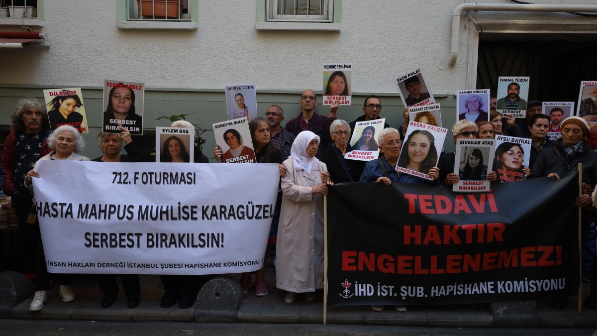 İstanbul İHD hapishane komisyonu, hasta tutsakların durumuna dikkat çekmek için her hafta düzenledikleri “F Oturması” eyleminin 712‘incisini Beyoğlu’nda bulunan dernek binaların önünde gerçekleştirdi. Bu hafta, Diyarbakır Kadın Kapalı Cezaevi’nde tutulan hasta tutsak Muhlise Karagüzel’in (64), durumuna dikkat çekildi. Çok sayıda hak savunucusunun katıldığı eylemde “Tedavi haktır engellenemez”, “Hasta mahpus Muhlise Karagüzel serbest bırakılsın” pankartları açıldı. “İnsan haklarıyla insandır” ve “Tecrit öldürür dayanışma yaşatır” sloganları atıldı.