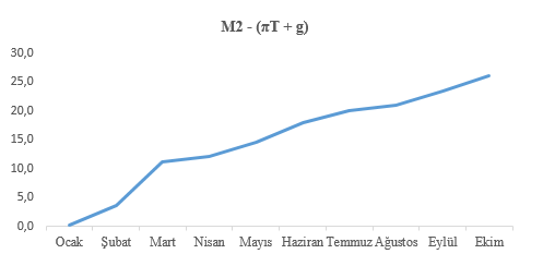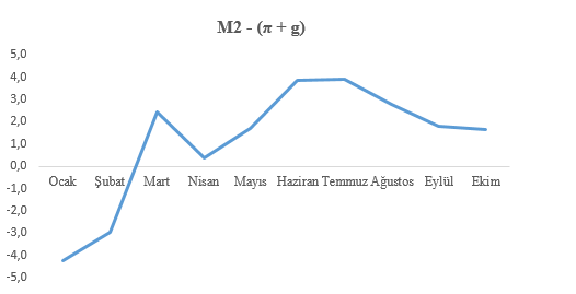 Bu grafik bize Merkez Bankasınca ilk on ayda artırılan para arzının (M2), hedeflenen enflasyon oranıyla (yüzde 5) beklenen büyüme oranı (yüzde 3,9) toplamından (πT + g) aylar itibarıyla ne kadar saptığını gösteriyor.