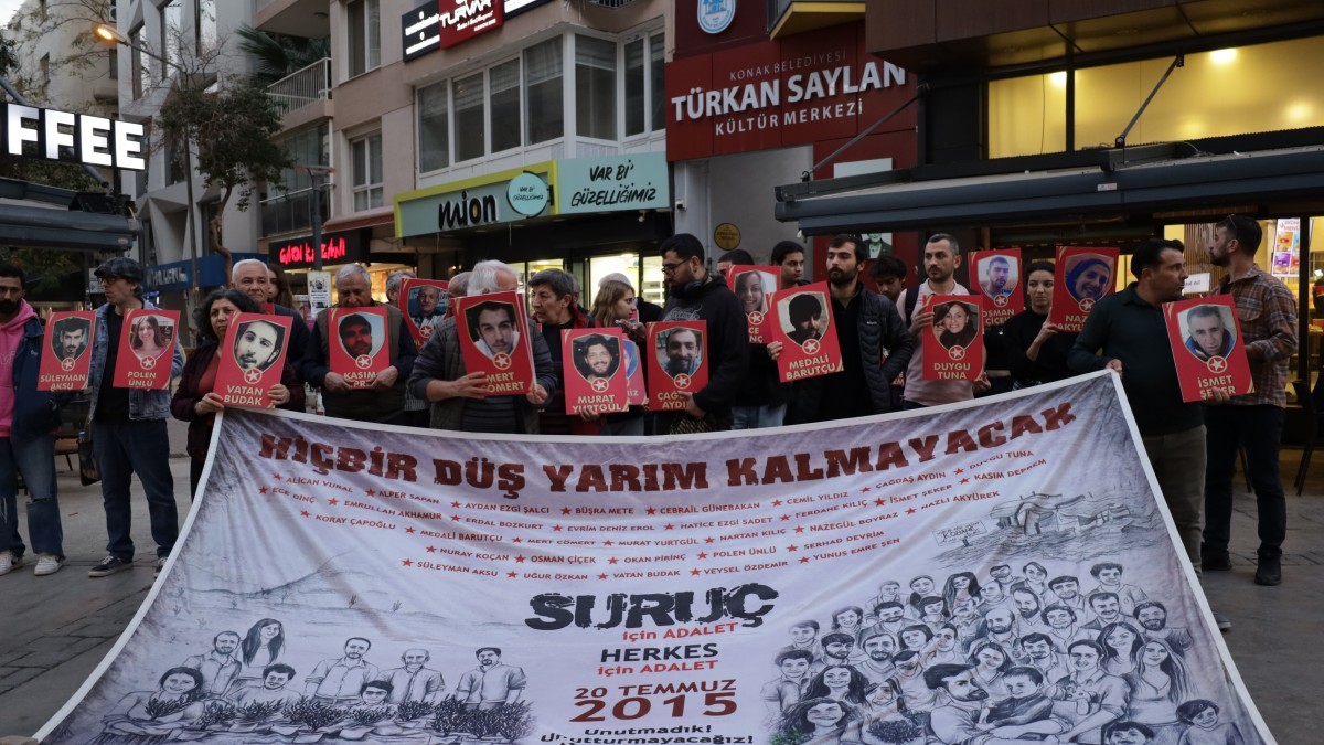 Suruç Aileleri İnisiyatifi de her ay yaptığı oturma eylemine Alsancak Türkan Saylan Kültür Merkezi önünde devam etti. “Hiçbir düş yarım kalmayacak” pankartının açıldığı açıklamada yaşamını yitiren 33 kişinin fotoğrafları taşındı. Sık sık “Suruç için adalet, herkes için adalet”, “Suruç’un hesabı sorulacak”, “Amed, Suruç, Ankara hesap sormaya” sloganlarının atıldığı açıklamaya çok sayıda yurttaş katıldı. Oturma eyleminde konuşan SGDF üyesi Hayal Daştan, Rojin Kabaiş’in ailesinin adalet arayışına değindi. Halay Daştan, Rojin Kabaiş cinayetinde ihmali ve sorumluluğu olanların yargılanması gerektiğine dikkat çekti. Pirsûs katliamının görülecek olan duruşmasına çağrı yapan Hayal Daştan, şunları söyledi: “Katliam davamızın bir sonraki duruşması 27 Kasımda Urfa da görülecek. Adalet arayan tüm dostlarımızı 27 Kasım’da görülecek duruşmamıza davet ediyor. Dayanışmayı büyütme çağrısı yapıyoruz.”