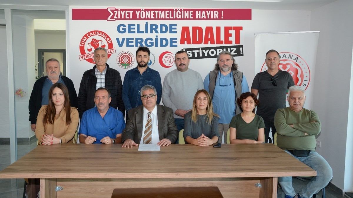 Adana Tabip Odası, SES ve Genel Sağlık-İş, sağlık çalışanlarının artan vergi yüküne ve ücretlerdeki erimeye dikkat çekmek için “Vergide ve gelirde adalet” talebiyle Adana Tabip Odası’nda basın açıklaması yaptı. Basın açıklamasını okuyan Adana Tabip Odası Başkanı Uzm. Dr. Özden Polatöz, aile sağlığı merkezi çalışanlarından kesilen ve yüzde 35’e kadar çıkan vergi oranlarının adaletsizliğine dikkat çekerek, “Aile hekimliği çalışanları vergide adalet istiyor. Ücretlerimiz enflasyon karşısında eriyor, satın alma gücümüz düşüyor. Tüm ücretliler gibi yüksek oranda peşin vergi kesintileri ile yoksullaştırılıyoruz” dedi.