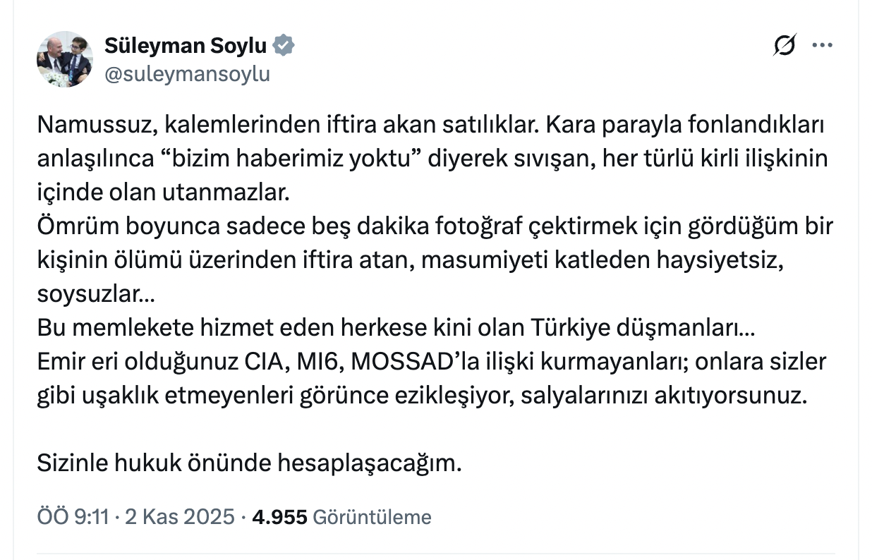 Eski İçişleri Bakanı Süleyman Soylu, sosyal medya hesabından ateş püskürdü. Kendisine iftira atıldığını yazan Soylu, “Namussuz, kalemlerinden iftira akan satılıklar” diye bahsettiği kişilerle “hukuk önünde hesaplaşacağını” söyledi. Soylu’nun “Ömrüm boyunca sadece beş dakika fotoğraf çektirmek için gördüğüm bir kişinin ölümü üzerinden iftira atan, masumiyeti katleden haysiyetsiz, soysuzlar” ifadeleri, cezaevinde ölü bulunan Thodex kurucusu Faruk Fatih Özer’i akıllara getirdi.