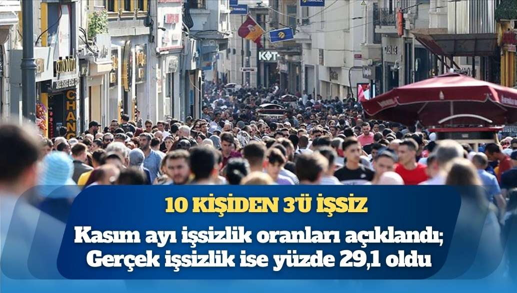 Türkiye İstatistik Kurumu (TÜİK) kasım ayına ilişkin işsizlik rakamlarını açıkladı. Buna göre kasımda mevsim etkisinden arındırılmamış işsizlik oranı yüzde 8,6 oldu. Gerçek işsizlik oranı ise yüzde 29,1 oldu.