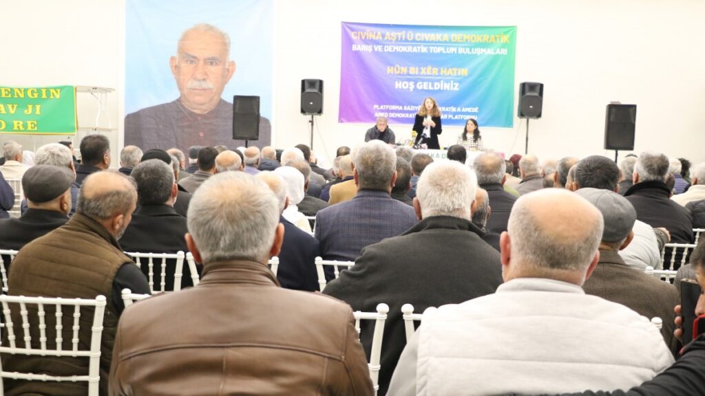 Demokratik Kurumlar Platformu, Barış ve Demokratik Toplum Buluşmaları kapsamında Farqîn’de (Silvan) halk toplantısı düzenledi. Bir düğün salonunda gerçekleştirilen buluşmada, Kürt Halk Önderi Abdullah Öcalan’ın dev posteri ve Kürtçe “Farqîn’den Önder Apo’ya binlerce selam” pankartı açıldı. Çok sayıda siyasi parti ile sivil toplum örgütü temsilcisinin yanı sıra yurttaşların katıldığı toplantıya, Çetin Arkaş, Özgür Kadın Hareketi’nden (Tevgera Jinên Azad-TJA) Ayla Akat Ata ve Asrın Hukuk Bürosu avukatlarından Raziye Öztürk konuşmacı olarak katıldı. Konuşmacılar salonda ayakta, alkış ve zılgıtla karşılandı.
