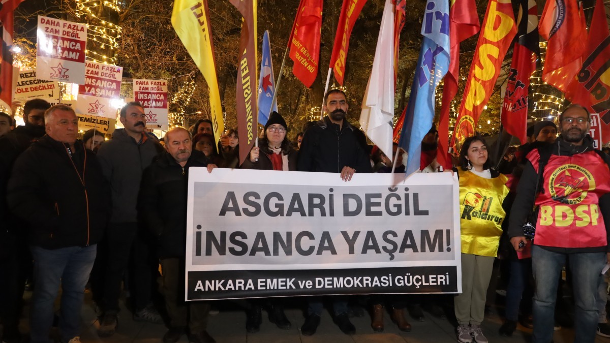 Ankara Emek ve Demokrasi Güçleri, 28 bin 75 TL olarak açıklanan asgari ücret zammını protesto etmek için Yüksel Caddesi’nde bir araya geldi “Asgari değil insanca yaşam” pankartının açıldığı açıklamada sık sık “İşçilerin birliği sermayeyi yenecek”, “İnsanca bir yaşam sosyalizmde” ve “Sefalete teslim olmayacağız” sloganları atıldı.