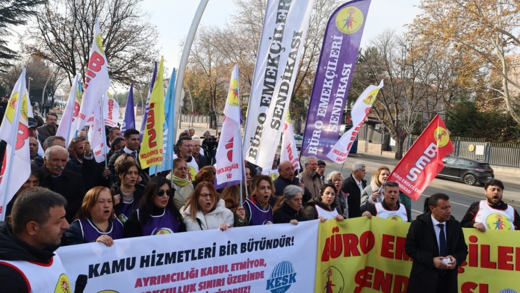 Kamu Emekçileri Sendikaları Konfederasyonu’na (KESK) bağlı Büro Emekçileri Sendikası (BES) 8 Aralık’ta Meclis Genel Kurulu’nda görüşülmeye başlanacak olan 2026 Yılı Merkezi Yönetim Bütçe Kanun Teklifi’ne dair Meclis Dikmen Kapısı önünde açıklama yaptı. Açıklamada, “Kamu hizmetleri bir bütündür ayrımcılığı kabul etmiyor, yoksulluk sınırı üzerinde bir ücret istiyoruz” pankartı açılırken “Ücrette adalet istiyoruz”, “Merkez taşra ayrımı kaldırılsın” sloganları atıldı.