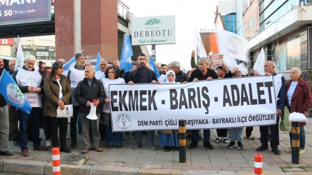 İzmir’de Halkların Eşitlik ve Demokrasi Partisi (DEM Parti) Çiğli, Bayraklı ve Karşıyaka ilçe örgütleri “Ekmek ve barış için bütçe” talebiyle açıklama yaptı. Çiğli’de yapılan açıklamada “emek, barış, adalet” pankartı açıldı ve “Yaşasın ekmek, barış mücadelemiz” sloganı atıldı.