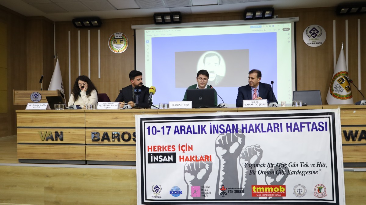 Wan’daki demokratik kitle örgütleri öncülüğünde 10-17 Aralık İnsan Hakları Haftası kapsamında, “Barış ve çatışma çözümleri” başlıklı paneli düzenlendi. Wan Barosu Tahir Elçi Konferans salonunda düzenlenen panele, Avukat Gulan Çağın Kaleli, İnsan Hakları Derneği (İHD) Genel Sekreteri Osman İşçi ve Doç. Dr. Vahap Coşkun konuşmacı olarak katıldı. Panelin moderatörlüğünü ise İHD Wan Şube Eşbaşkanı Mehmet Salih Coşkun üstlendi.