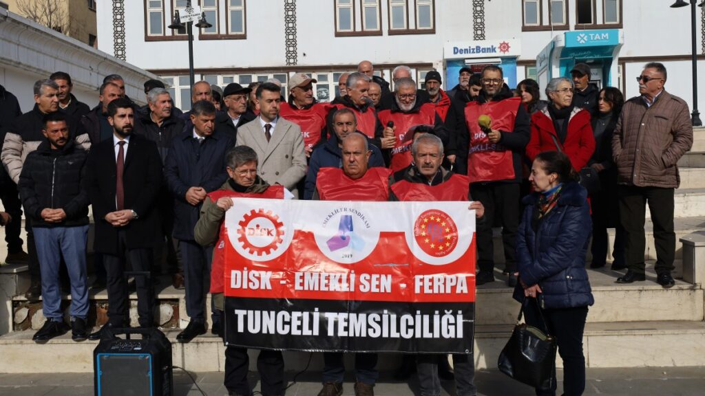 Türkiye Devrimci İşçi Sendikaları Konfederasyonu (DİSK) Devrimci Emekliler Sendikası (Emekli-Sen) Dêrsim İl Temsilciliği, düşük asgari ücret zammı ve emekli maaşlarına nedeniyle iktidarı düzenlediği açıklama ile protesto etti. Yeraltı Çarşısı üstünde gerçekleştirilen açıklamaya, sivil toplum örgütleri ve siyasi partilerin temsilcileri destek verdi. Açıklamayı yapan DİSK Emekli-Sen Tunceli İl Temsilciliği Mali Sekreteri Yusuf Topçu, iktidarın emeklilere karşı “acımasız” politikalarına devam ettiğini ifade ederek, “TÜİK tarafından yıllık enflasyon oranları güllük gülistanlık olarak gösterilmektedir. Neredeyse ülkemizde enflasyon yoktur denilecek. Türkiye’de milyonlarca emekli her geçen gün daha da yoksullaşırken, kaynak yok, emekli sayısı çok, emekliler beklediğimizden daha uzun yaşıyor gibi gerçek dışı söylemlerle kamuoyu yanıltılmaktadır. Türkiye’de Sosyal Güvenlik’in temel sorunu emekli sayısı değildir. Sorun, yetersiz istihdam, kayıt dışı çalışma, düşük ücretler ve devlet katkısının azalmasıdır” ifadelerini kullandı.