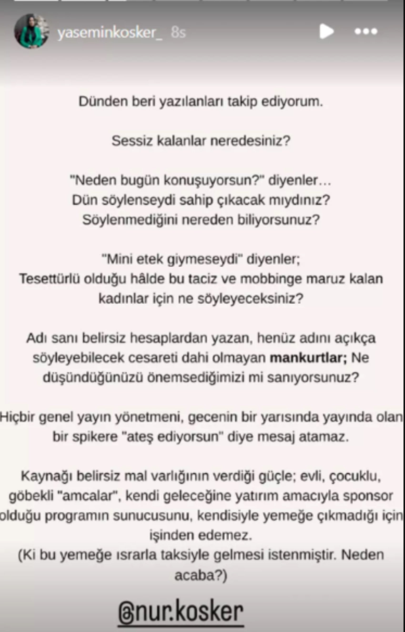 Köşker şöyle devam etti: “Kaynağı belirsiz mal varlığının verdiği güçle; evli, çocuklu, göbekli ‘amcalar’, kendi geleceğine yatırım amacıyla sponsor olduğu programın sunucusunu, kendisiyle yemeğe çıkmadığı için işinden edemez. (Ki bu yemeğe ısrarla taksiye gelmesi istenmiştir. Neden acaba?”