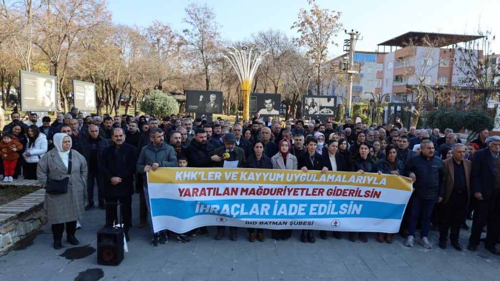 İnsan Hakları Derneği (İHD) Êlih Şubesi, 15 Temmuz 2016’da yaşanan darbe girişimi sonrasında çıkarılan Kanun Hükmünde Kararnamelerle (KHK) işlerine son verilen kamu çalışanlarının işlerine iade edilmesi talebiyle açıklama yaptı. Yılmaz Güney Parkı’nda yapılan açıklamada, “KHK’ler ve kayyım uygulamalarıyla yaratılan mağduriyetler giderilsin. İhraçlar iade edilsin” pankartı açıldı. Açıklamaya, sendikalar, siyasi parti ve sivil toplum örgütü temsilcileri de destek verdi.