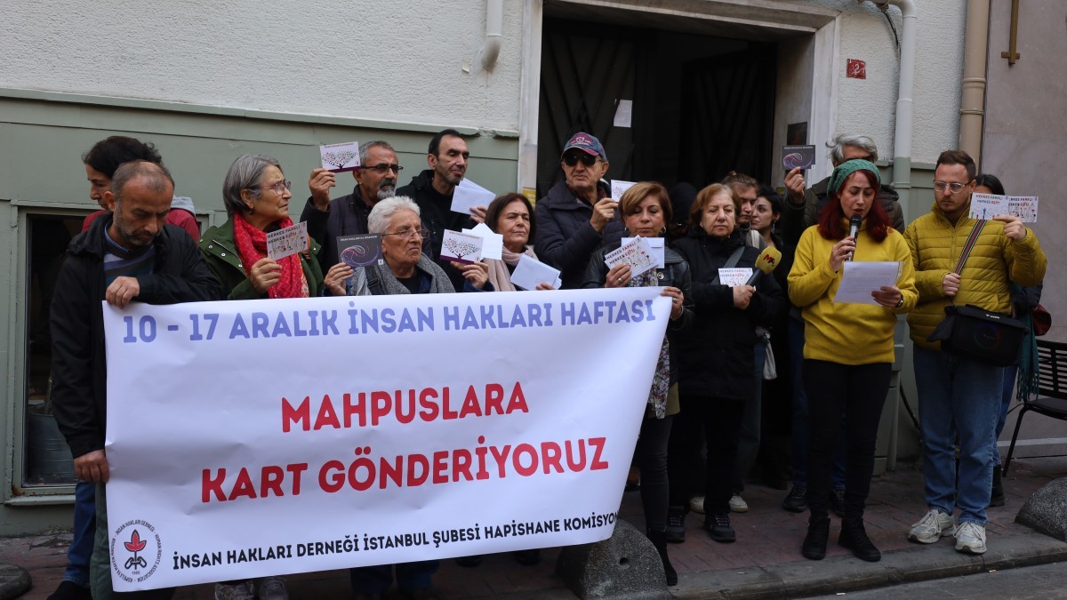 İnsan Hakları Derneği (İHD) İstanbul Şubesi Hapishane Komisyonu, 10-17 Aralık İnsan Hakları Haftası kapsamında tutsaklara dayanışmak için kartı gönderdi. Kart gönderimi öncesi Beyoğlu’nda bulunan dernek binaları önünde açıklama yapıldı. Çok sayıda kişinin katıldığı açıklamada, “Hasta Mahpuslara kart gönderiyoruz” pankartı açıldı. Açıklama da sık sık “Tecrit öldürür dayanışma yaşatır”, “İnsan haklarıyla insandır” sloganları atıldı.