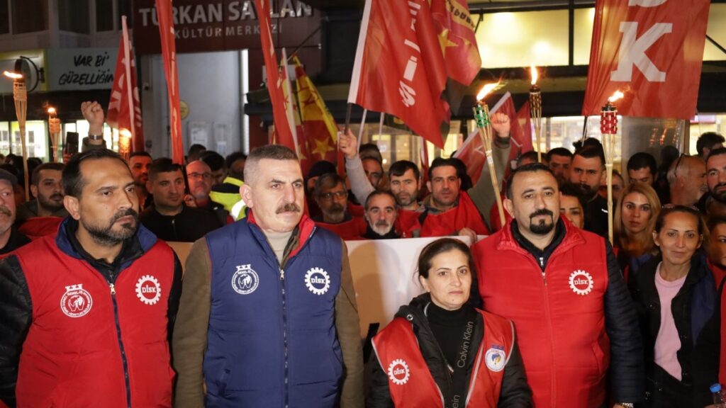 Devrimci İşçi Sendikaları Konfederasyonu (DİSK) Genel Hizmet İşçileri Sendikası’na (Genel-İş) üye İzmir Büyükşehir Belediyesi (İzBB) işçileri, işlerine iade edilmeleri ve Toplu İş Sözleşmesi’ne (TİS) uyulması talebiyle başlattıkları eylemin ikinci gününde Kültürpark Lozan Kapısı önünde bir araya gelerek, Alsancak Türkan Saylan Kültür Merkezi önüne meşaleli yürüyüş gerçekleştirdi. “Şirkete iadeler ve işten çıkarmalar son bulsun artık yeter” pankartının açıldığı yürüyüşte sık sık “Hak, hukuk, adalet”, “Zafer direnen emekçinin olacak” ve “İş, ekmek, adalet” sloganları atıldı. Yürüyüşe Halkların Eşitlik ve Demokrasi Partisi (DEM Parti) İzmir Milletvekili İbrahim Akın’ın yanı sıra çok sayıda siyasi parti ve sivil toplum örgütü temsilcisi katıldı.