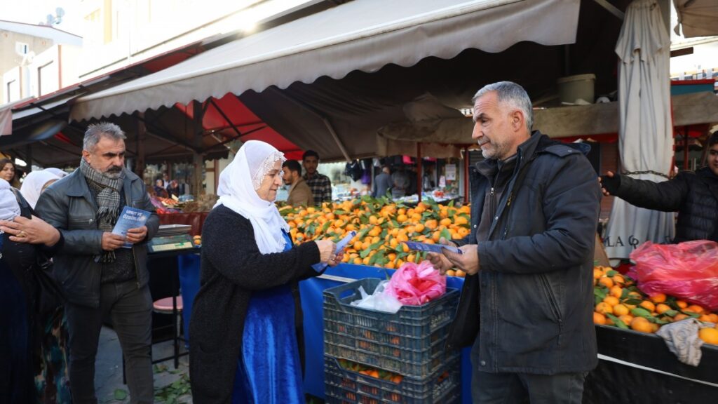 Amed’de 4 Ocak tarihinde İstasyon Meydanı’nda Kürt Halk Önderi Abdullah Öcalan’ın fiziki özgürlüğü talebiyle gerçekleştirilecek olan “Umut ve Özgürlük” mitingine ilişkin çalışmalarını sürdüren Demokratik Kurumlar Platformu (DEKUP), Mersin’de Halkların Eşitlik ve Demokrasi Partisi (DEM Parti) Akdeniz ilçe binasında bir araya geldi. Heyet, ilçe binasından Yeni Hal Pazar’ına kadar bulunan esnaflara ziyaret ederek mitinge davet etti. Broşür dağıtımı boyunca sesli bir şekilde mitingin önemine vurgu yapıldı. Mitinge katılmak isteyen yurttaşlar, isimlerini bulundukları ilçe örgütlerine yazdırmaları çağrısında bulunarak 3 Aralık saat 23.00’te araçların hareket edeceklerini söyledi. Ziyaret boyunca sık sık, “Bê Serak jiyan nabe”, “Jin jiyan azadî” sloganları atıldı.