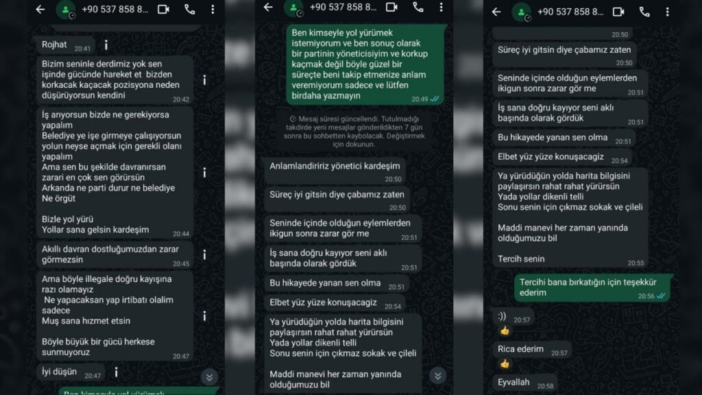 MÛŞ – Polis ajanlaştırmaya çalıştığı DBP yöneticisi Rojhat Acar’a “Bu hikayede yanan sen olma. Elbet yüz yüze konuşacağız. Ya yürüdüğün yolda harita bilgisini paylaşırsın rahat rahat yürürsün ya da yollar dikenli telli sonu senin için çıkmaz sokak ve çileli” mesajı gönderdiği ortaya çıktı.