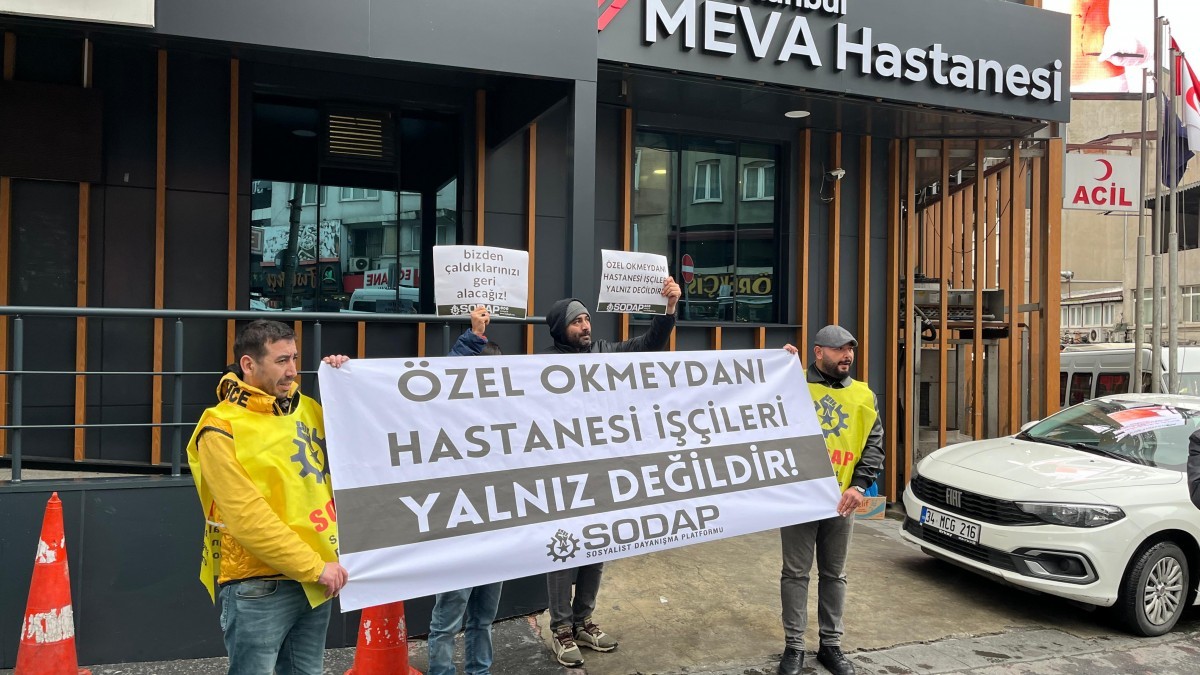Şafak Grubu’na ait Özel Okmeydanı Hastanesi’nde çalışan 180 sağlık emekçisinin ücretsiz izne çıkarılmasına dair başlatılan nöbet eylemi sürüyor. Sosyalist Dayanışma Platformu (SODAP), Özel Okmeydanı Hastanesi işçileri ile dayanışmak için aynı şirkete ait olan Özel Şafak Hastaneleri Grubu’na bağlı Meva Hastanesi önünde eylem gerçekleştirdi. Eylemde “Özel Okmeydanı Hastanesi işçileri yalnız değildir” pankartı açıldı.