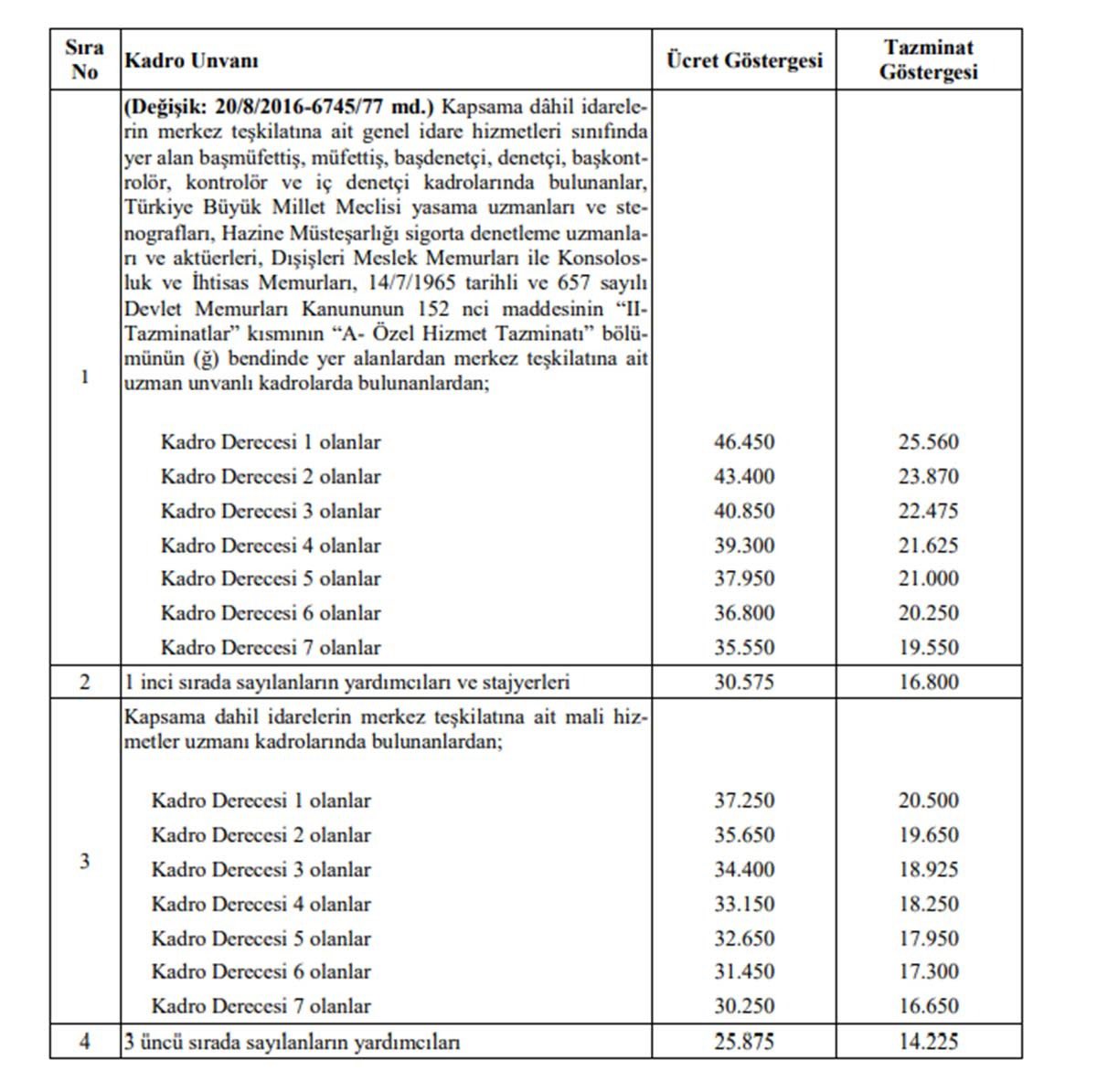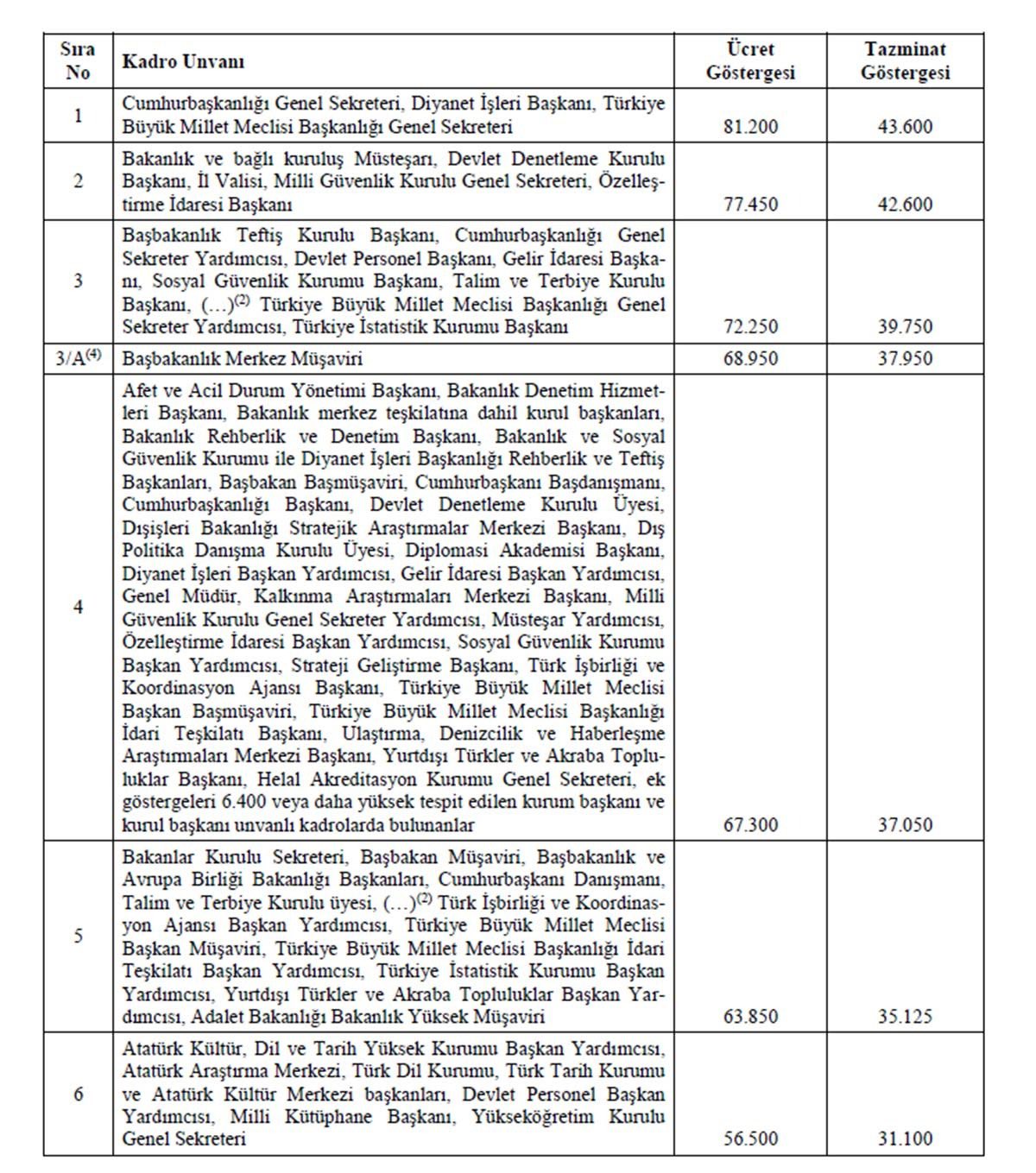 | Yapılacak zamdan yararlanacak mesleklerin detayları ise şu şekilde:1- TBMM Genel Sekreteri, SGK Başkanı, AFAD Başkanı, Talim ve Terbiye Kurulu Başkanı, TÜİK Başkan, Bakanlık Rehberlik ve Denetim Başkanları, Büyükelçiler, Diyanet İşleri Başkanı, Diyanet İşleri Başkan Yardımcısı, Gelir İdaresi Başkan Yardımcısı, Genel Müdür, ÖİB, SGK, AFAD Başkan Yardımcıları, TİKA Başkanı, Adalet Bakanlığı Bakanlık Yüksek Müşaviri, Bakanlık ve Müsteşarlık Müşaviri, bakanlık il müdürü ve bakanlık bölge müdürü, Defterdar, İl Emniyet Müdürü, İl Müftüsü,2- Kamu kurumlarının merkez teşkilatına ait genel idare hizmetleri sınıfında yer alan başmüfettiş, müfettiş, başdenetçi, denetçi, başkontrolör, kontrolör ve iç denetçi kadrolarında bulunanlar, Türkiye Büyük Millet Meclisi yasama uzmanları ve stenografları, Hazine Müsteşarlığı sigorta denetleme uzmanları ve aktüerleri, Dışişleri Meslek Memurları ile Konsolosluk ve İhtisas Memurları, 14/7/1965 tarihli ve 657 sayılı Devlet Memurları Kanununun 152 nci maddesinin “II- Tazminatlar” kısmının “A- Özel Hizmet Tazminatı” bölümünün (ğ) bendinde yer alanlardan merkez teşkilatına ait uzman unvanlı kadrolarda bulunanlar ve bunların yardımcıları3- Cumhurbaşkanlığı Genel Sekreteri4- Kamu Başdenetçisi, TRT Genel Müdürü, YÖK ve ÖSYM Başkanı, Yükseköğretim Yürütme Kurulu Üyeleri, Yükseköğretim Denetleme Kurulu Başkan ve üyeleri, ÖSYM başkan Yardımcıları,5- MİAH sınıfında olanlardan, Merkezde görevli diğer Valiler, Kurul Başkanı, Genel Müdür, Strateji Geliştirme Başkanı ile bu görevleri yürüten merkezde görevli Valiler, Birinci sınıf olup 1 inci derecenin dördüncü kademesinden aylık alanlar, 1 inci dereceden aylık alanlar, Diğerleri (Kaymakam Adayları hariç)6- Cumhurbaşkanı, Türkiye Büyük Millet Meclisi Başkanı ve Başbakanın yakın koruma ve makam hizmetlerinde görev yapan personel7- Hazine ve Maliye Bakanlığı, Strateji ve Bütçe Başkanlığı ile Gelir İdaresi Başkanlığında çalışıp, yukarıda sayılan 1 ve 2 nolu kısımlara girenler. (Bunlara ayrıca en yüksek Devlet memuru aylığının yüzde 200’ünü geçmemek üzere ilave ek ödeme yapılacak)TBMM Plan ve Bütçe Komisyonu’nda oy birliği ile kabul edilen önergeye göre, 30 bin liraya varan tutarda zam alacak yönetici ve kariyer personelin tam listesi şöyle: |