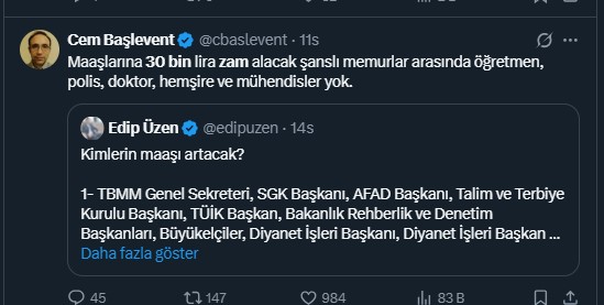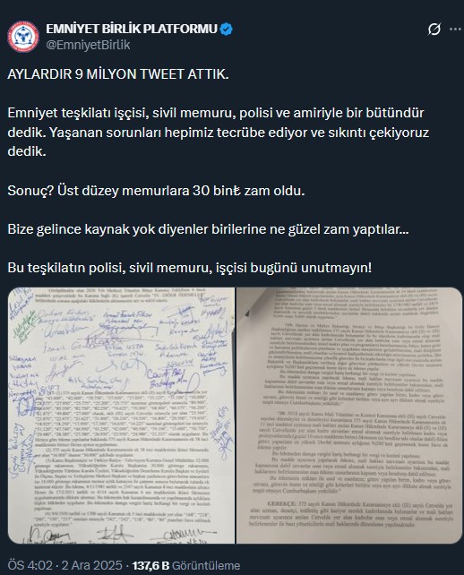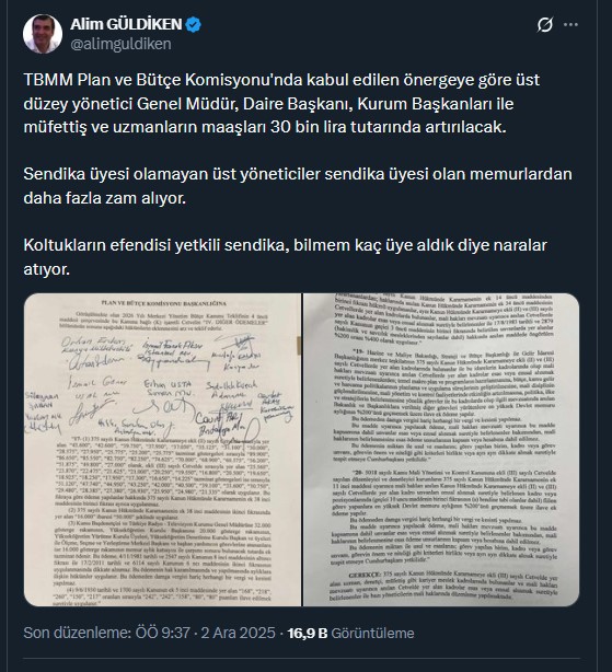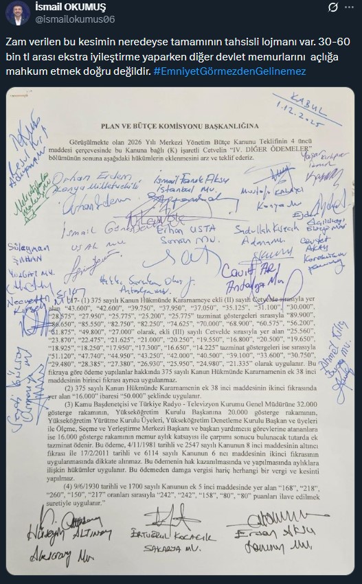 AKP’li eski vekil Şamil Tayyar ise Plan ve Bütçe Komisyonu Başkan Mehmet Muş’la yaptığı görüşmeye ilişkin notlar paylaştı. Kariyer mesleklerin can çekiştiğini ifade eden Muş, yönetici personel ile müşavirlerin neden düzenlemeye dahil edildiğine yönelik bir açıklama ise yapmadı.