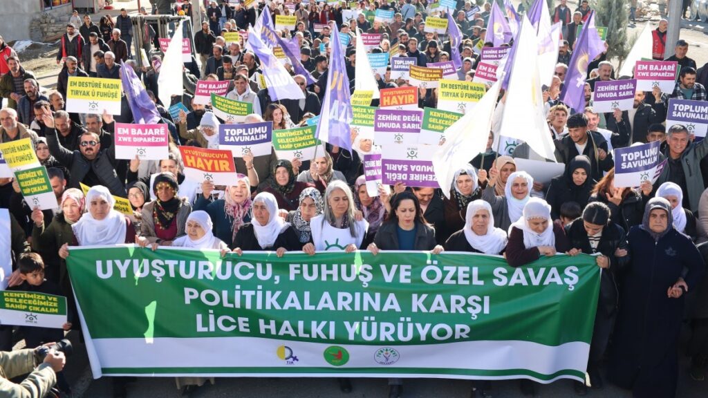 Amed’in Licê ilçesinde Özgür Kadın Hareketi (Tevgera Jinên Azad-TJA) öncülüğünde “Uyuşturucu, fuhuş ve özel savaş politikalarına karşı yürüyoruz” şiarıyla yürüyüş düzenlendi. Halis Toprak Fabrikası önünde bir araya gelen kitle, buradan kent merkezine doğru yürüyüşe geçti. Demokratik Bölgeler Partisi (DBP) Eş Genel Başkanı Çiğdem Kılıçgün Uçar’ın da katıldığı yürüyüşte, “Uyuşturucu, fuhuş ve özel savaş politikalarına karşı Lice halkı yürüyor” pankartı açıldı, sık sık “Uyuşturucu ve fuhşa karşı şiyar be”, ‘Jin, jiyan, azadî”, “Uyuşturucu ve fuhşa hayır” sloganları atıldı. Yürüyüşte “Kentimize ve geleceğimize sahip çıkalım”, “Uyuşturucuya hayır”, “Toplumu savunalım” ve “Zehre değil, umuda sarıl” dövizleri taşındı. Yoğun katılımın olduğu yürüyüşün Demokrasi Meydanı’nda son buldu.