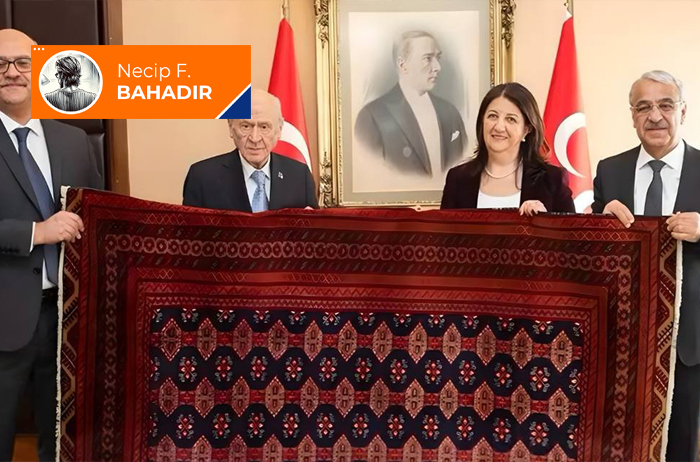 Bahçeli’in aktörü olduğu bir haber daha; “12 Aralık 2025 tarihinde DEM Parti heyeti Meclis’te bizleri ziyaret ettiklerinde, kurucu önder Abdullah Öcalan’ın Şanlıurfa’da özel olarak dokuttuğu bir kilimi bize hediye etti. Kendisine Türk ve Kürt birliği ile kardeşliği konusundaki samimiyeti için teşekkür ediyorum. Bunu memnuniyetle karşıladım ve bizi ziyaret eden heyete şunu söyledim; “Kültürümüzde her kilimin bir ismi vardır, bu kilime de 27 Şubat 2025 Barış ve Demokrasi Kilimi adını veriyorum”