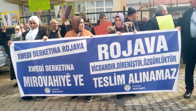 DEM Parti Alaşehir İlçe Örgütü, Rojava’ya yönelik saldırılara ilişkin ilçe binası önünde basın açıklaması yaptı. Basın açıklamasını okuyan DEM Parti Alaşehir Kadın Meclisi Sözcüsü Demet Altun, Rojava’ya yönelik saldırıların planlı ve çok boyutlu bir yıkım politikasının parçası olduğunu belirterek, “Bugün Rojava’da yaşananlar yerel bir çatışma değil; uluslararası ve bölgesel güçlerin çıkar hesapları doğrultusunda şekillenen bilinçli bir yıkım sürecidir. Kürt halkının hedef alınmasının nedeni açıktır. Rojava’da ortaya çıkan irade, emperyalist planlara boyun eğmeyen, teslim alınamayan bir halk gerçekliğini temsil etmektedir” dedi.